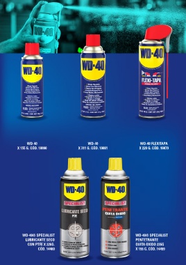 WD-40 WD-40 WD-40 FLEXITAPA X 155 G. CÓD. 10880 X 311 G. CÓD. 10881 X 220 G. CÓD. 10879 WD-40® SPECIALIST WD-40® SPECIALIST LUBRICANTE SECO PENTETRANTE CON PTFE X 226G. QUITA OXIDO 226G CÓD. 14460 X 155 G. CÓD. 14459