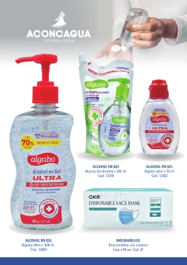 DISTRIBUIDORA ALCOHOL EN GEL ALCOHOL EN GEL Algabo Sanitizante x 300 ml. Algabo ultra x 70 ml. Cód. 12378 Cód. 12362 ALCOHOL EN GEL OKR BARBIJOS Algabo Ultra x 500 ml. Descartables con elástico Cód. 12363 Caja x 50 un. Cód. 27